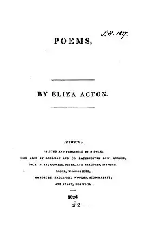 Acton had been writing poetry since at least 1822, as she wrote that year on the bottom of one of her poems.[lower-alpha 4] She wrote at least one while in France, "On Approaching Paris", which she dated 1826.[18] When she returned to England, she arranged for a collection to be published by Longman.[1] As was the practice for publishers at the time, Acton had to provide the names of subscribers—those who had pre-paid for a copy—who were listed inside the work; nearly all came from Suffolk. 328 copies were printed in October 1826 and a reprint was needed within a month.[19] She subsequently wrote some longer poems, including "The Chronicles of Castel Framlingham", which was printed in the Sudbury Chronicle in 1838, and "The Voice of the North", which was written in 1842 on the occasion of Queen Victoria's first visit to Scotland.[1] Other poems were published in a local periodical, the Sudbury Pocket Book.[15]