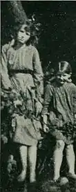 Elsie's father, Arthur, was a keen amateur photographer, and had set up his own darkroom. The picture on the photographic plate he developed showed Frances behind a bush in the foreground, on which four fairies appeared to be dancing. Knowing his daughter's artistic ability, and that she had spent some time working in a photographer's studio, he dismissed the figures as cardboard cutouts. Two months later the girls borrowed his camera again, and this time returned with a photograph of Elsie sitting on the lawn holding out her hand to a 1-foot-tall (30 cm) gnome. Exasperated by what he believed to be "nothing but a prank",[2] and convinced that the girls must have tampered with his camera in some way, Arthur Wright refused to lend it to them again.[3] His wife Polly, however, believed the photographs to be authentic.[2]