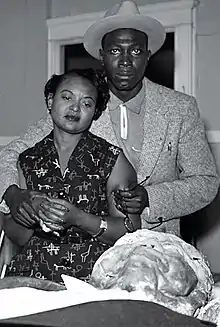 According to Simeon Wright and Wheeler Parker,[38] Till wolf-whistled at Bryant. Wright said "I think [Emmett] wanted to get a laugh out of us or something," adding, "He was always joking around, and it was hard to tell when he was serious." Wright stated that following the whistle he became immediately alarmed. "Well, it scared us half to death," Wright recalled. "You know, we were almost in shock. We couldn't get out of there fast enough, because we had never heard of anything like that before. A black boy whistling at a white woman? In Mississippi? No." Wright stated "The Ku Klux Klan and night riders were part of our daily lives".[32][39] Following his disappearance, a newspaper account stated that Till sometimes whistled to alleviate his stuttering.[40] His speech was sometimes unclear; his mother said he had particular difficulty with pronouncing "b" sounds, and he may have whistled to overcome problems asking for bubble gum.[41][42][43] She said that, to help with his articulation, she taught Till how to whistle softly to himself before pronouncing his words.[42]
