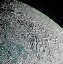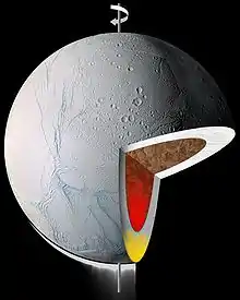 Initial mass estimates from the Voyager program missions suggested that Enceladus was composed almost entirely of water ice.[58] However, based on the effects of Enceladus's gravity on Cassini, its mass was determined to be much higher than previously thought, yielding a density of 1.61 g/cm3.[6] This density is higher than those of Saturn's other mid-sized icy satellites, indicating that Enceladus contains a greater percentage of silicates and iron.