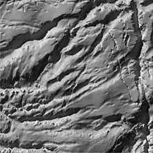 Two regions of smooth plains were observed by Voyager 2. They generally have low relief and have far fewer craters than in the cratered terrains, indicating a relatively young surface age.[62] In one of the smooth plain regions, Sarandib Planitia, no impact craters were visible down to the limit of resolution. Another region of smooth plains to the southwest of Sarandib is criss-crossed by several troughs and scarps. Cassini has since viewed these smooth plains regions, like Sarandib Planitia and Diyar Planitia at much higher resolution. Cassini images show these regions filled with low-relief ridges and fractures, probably caused by shear deformation.[63] The high-resolution images of Sarandib Planitia revealed a number of small impact craters, which allow for an estimate of the surface age, either 170 million years or 3.7 billion years, depending on assumed impactor population.[6][lower-alpha 2]