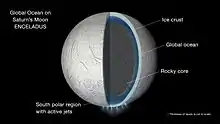 Measurements of Enceladus's "wobble" as it orbits Saturn—called libration—suggests that the entire icy crust is detached from the rocky core and therefore that a global ocean is present beneath the surface.[99] The amount of libration (0.120° ± 0.014°) implies that this global ocean is about 26 to 31 kilometers (16 to 19 miles) deep.[100][101][102][103] For comparison, Earth's ocean has an average depth of 3.7 kilometers.[102]