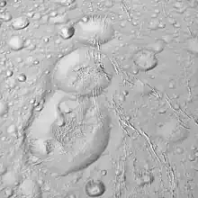 Cassini observations provided a much closer look at the crater distribution and size, showing that many of Enceladus's craters are heavily degraded through viscous relaxation and fracturing.[63] Viscous relaxation allows gravity, over geologic time scales, to deform craters and other topographic features formed in water ice, reducing the amount of topography over time. The rate at which this occurs is dependent on the temperature of the ice: warmer ice is easier to deform than colder, stiffer ice. Viscously relaxed craters tend to have domed floors, or are recognized as craters only by a raised, circular rim. Dunyazad crater is a prime example of a viscously relaxed crater on Enceladus, with a prominent domed floor.[64]