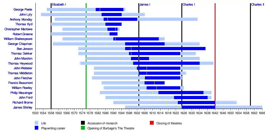 English Renaissance theatre, also known as Renaissance English theatre and Elizabethan theatre, refers to the theatre of England between 1558 and 1642.