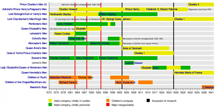 Elizabethan actors never played the same show on successive days and added a new play to their repertoire every other week. These actors were getting paid within these troupes so for their job, they would constantly learn new plays as they toured different cities in England. In these plays, there were bookkeepers that acted as the narrators of these plays and they would introduce the actors and the different roles they played. At some points, the bookkeeper would not state the narrative of the scene, so the audience could find out for themselves. In Elizabethan and Jacobean plays, the plays often exceeded the number of characters/roles and did not have enough actors to fulfil them, thus the idea of doubling roles came to be.[46] Doubling roles is used to reinforce a plays theme by having the actor act out the different roles simultaneously.[47] The reason for this was for the acting companies to control salary costs, or to be able to perform under conditions where resources such as other actor companies lending actors were not present.[47]