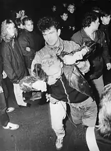 In a 1931 biography written for the Cadre Division of the Comintern,[20] Mielke recalled, "We took care of all kinds of work; terror acts, protecting illegal demonstrations and meetings, arms-trafficking, etc. The last work, which was accomplished by a Comrade and myself, was the Bülowplatz Affair" (German: "Wir erledigten hier alle möglichen Arbeiten, Terrorakte, Schutz illegaler Demonstrationen und Versammlungen, Waffentransport und reinigung usw. Als letzte Arbeit erledigten ein Genosse und ich die Bülowplatzsache.").[21]