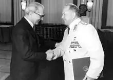 In addition to his role as head of the Stasi, Mielke was also an Army General in the National People's Army (Nationale Volksarmee), and a member of the SED's ruling Politburo. Dubbed "The Master of Fear"[10] (German: der Meister der Angst) by the West German press, Mielke was one of the most powerful and most hated men in East Germany.[11]