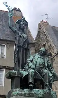 In 1903 a major controversy accompanied the installation of a monument in Tréguier designed by Jean Boucher. Placed in the local cathedral square, it was interpreted as a challenge to Catholicism, and led to widespread protests, especially because the site was normally used for the temporary pulpit erected at the traditional Catholic festival of the Pardon of St Yves. It also included the Greek goddess Athena raising her arm to crown Renan gesturing in apparent challenge towards the cathedral.[33][34] The local clergy organised a protest calvary sculpture designed by Yves Hernot as "a symbol of the triumphant ultramontaine church."