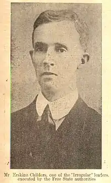 In February 1921 Childers became editor of the Irish Bulletin and Director of Publicity for the Dáil after the arrest of Desmond FitzGerald.[123] He stood as a Sinn Féin (anti-treaty) candidate at the 1922 general election but lost his seat.[124]