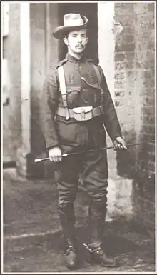 A battery from the HAC formed part of the hastily constituted City Imperial Volunteers, something of an ad hoc force set up from soldiers from different volunteer regiments, funded by City institutions and provided with the most modern equipment. Childers became a member of the artillery division of this new force, classed as a "spare driver" to care for horses and ride in the ammunition supply train.[25] On 2 February 1900, after three weeks' training, the unit set off for South Africa.[26][24][27] Most of the new volunteers and their officers were seasick and it largely fell to Childers to care for the troop's 30 horses.[28] After a three-week voyage, the company was disappointed not to see immediate action but on 26 June, while escorting a supply train of slow ox-wagons, Childers first came under fire during a three-day skirmish in defence of the column. It was a smartly executed defence of a beleaguered infantry regiment on 3 July that established the worth of his unit and more significant engagements followed.[29]