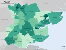 The administrative county and County Council was formed in 1889.[32] The county was made a non-metropolitan county as part of the 1970s local government reorganisation.[33] Its present boundaries were set in 1998 when the Thurrock and Southend-on-Sea separated from the non-metropolitan county to become unitary authorities.[34] In 1997, the Lieutenancies Act, which defined Essex for ceremonial purposes as the current non-metropolitan county and the unitary authorities formerly part of it.[35]