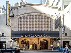 The facade is symmetrically arranged. The ground floor is clad in rusticated blocks of terracotta, painted in a limestone color, above a granite water table. At ground level, the auditorium entrance includes two arched openings, each with four aluminum and glass doors. The voussoirs of the arches are made of rusticated blocks, while the keystones at the centers of each arch are shaped like brackets. Within each arch, the spaces above the doors are infilled with black glazed tiles; originally, these spaces were filled with metal tracery. Between the arched doors is a smaller doorway, which is topped by a large keystone. Above all of these openings is a marquee with the name "Barrymore", which is supported by ornate bronze brackets.[15] The presence of the large marquee obscures the contrast between the ground floor and upper stories.[16] The brackets originally supported a smaller bronze-and-glass canopy, which curved upward in front of either arch.[5][17]