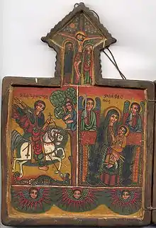 The faith and practice of Orthodox Ethiopian Christians include elements from Miaphysite Christianity as it has developed in Ethiopia over the centuries. Christian beliefs include belief in God (in Ge'ez / Amharic, ′Egziabeher, lit. "Lord of the Universe"), veneration of the Virgin Mary, the angels, and the saints, besides others. According to the Ethiopian Orthodox Church itself, there are no non-Christian elements in the religion other than those from the Old Testament, or Higge 'Orit (ሕገ ኦሪት), to which are added those from the New Testament, or Higge Wongiel (ሕገ ወንጌል).[53] A hierarchy of Kidusan/ቅዱሳን (angelic messengers and saints) conveys the prayers of the faithful to God and carries out the divine will, so when an Ethiopian Christian is in difficulty, he or she appeals to them as well as to God. In more formal and regular rituals, priests communicate on behalf of the community, and only priests may enter the inner sanctum of the usually circular or octagonal church where the tabot ("ark") dedicated to the church's patron saint is housed.[54] On important religious holidays, the tabot is carried on the head of a priest and escorted in procession outside the church. It is the tabot, not the church, which is consecrated. At many services, most parish members remain in the outer ring, where debteras sing hymns and dance.[55]