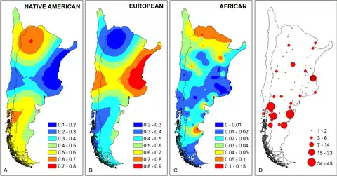 - Avena; et al. (2012). "Heterogeneity in Genetic Admixture across Different Regions of Argentina". PLOS ONE. 7 (4): e34695. Bibcode:2012PLoSO...734695A. doi:10.1371/journal.pone.0034695. PMC 3323559. PMID 22506044.