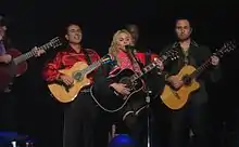 According to the film's music producer Nigel Wright, the lead actors would first sing the numbers backed by a band and orchestra before working with Parker and music supervisor David Caddick "in a more intimate recording environment [to] perfect their vocals".[46] More trouble arose as Madonna was not completely comfortable with "laying down a guide vocal simultaneously with an 84-piece orchestra" in the studio. She was used to singing over a pre-recorded track and not having musicians listen to her. Also, unlike her previous soundtrack releases, she had little to no creative control. "I'm used to writing my own songs and I go into a studio, choose the musicians and say what sounds good or doesn't ... To work on 46 songs with everyone involved and not have a big say was a big adjustment," she recalled.[47] An emergency meeting was held between Parker, Lloyd Webber and Madonna, where it was decided that the singer would record her part at Whitfield Street Studios, a contemporary studio, while the orchestration would take place elsewhere. She also had alternate days off from the recording to preserve and strengthen her voice.[5][48]