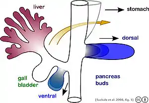 The pancreas forms during development from two buds that arise from the duodenal part of the foregut, an embryonic tube that is a precursor to the gastrointestinal tract.[11] It is of endodermal origin.[11] Pancreatic development begins with the formation of a dorsal and ventral pancreatic bud. Each joins with the foregut through a duct. The dorsal pancreatic bud forms the neck, body, and tail of the developed pancreas, and the ventral pancreatic bud forms the head and uncinate process.[11]
