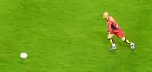 A memorable incident happened when Manchester United faced Leeds United in March 2001. After dropping a cross from Robbie Keane, Barthez deliberately kicked out with his foot at Ian Harte, who fell to the ground on the edge of six yard box, and the referee awarded a penalty to Leeds. Harte stepped up but Barthez made a low, one-handed save to his right.[20] The only blemish in his first season was his failed attempt at "psyching out" West Ham United's Paolo Di Canio in the FA Cup Fourth Round; Di Canio beat the offside trap, while Barthez stood still with his hand up expecting the referee to blow his whistle, or Di Canio to stop.[21] Di Canio continued and scored the only goal of the game,[22][23] and later said it was "better to score and then see whether the goalkeeper is right or wrong".[24]