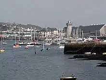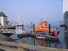 The Falmouth Docks were developed from 1858,[15] and the Royal National Lifeboat Institution (RNLI) opened Falmouth Lifeboat Station nearby in 1867. The present building dates from 1993 and also houses Her Majesty's Coastguard.[16] The RNLI operates two lifeboats from Falmouth: Richard Cox Scott, a 17-metre (56 ft) Severn-class all-weather boat,[17] and B-916 Robina Nixon Chard, an Atlantic 85 inshore lifeboat.