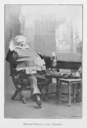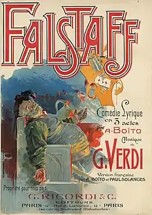 The first performances outside the Kingdom of Italy were in Trieste and Vienna, in May 1893.[41] The work was given in the Americas and across Europe. The Berlin premiere of 1893 so excited Ferruccio Busoni that he drafted a letter to Verdi, in which he addressed him as "Italy's leading composer" and "one of the noblest persons of our time", and in which he explained that "Falstaff provoked in me such a revolution of spirit that I can ... date [to the experience] the beginning of a new epoch in my artistic life."[42] Antonio Scotti played the title role in Buenos Aires in July 1893; Gustav Mahler conducted the opera in Hamburg in January 1894; a Russian translation was presented in St Petersburg in the same month.[43] Paris was regarded by many as the operatic capital of Europe, and for the production there in April 1894 Boito, who was fluent in French, made his own translation with the help of the Parisian poet Paul Solanges.[43] This translation, approved by Verdi, is quite free in its rendering of Boito's original Italian text. Boito was content to delegate the English and German translations to William Beatty-Kingston and Max Kalbeck respectively.[43] The London premiere, sung in Italian, was at Covent Garden on 19 May 1894. The conductor was Luigi Mancinelli, and Zilli and Pini Corsi repeated their original roles. Falstaff was sung by Arturo Pessina; Maurel played the role at Covent Garden the following season.[44] On 4 February 1895 the work was first presented at the Metropolitan Opera, New York;[45] Mancinelli conducted and the cast included Maurel as Falstaff, Emma Eames as Alice, Zélie de Lussan as Nannetta and Sofia Scalchi as Mistress Quickly.[46]
