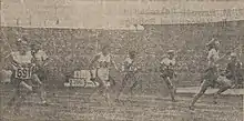 During the war, domestic competition in sports continued in German-occupied Holland, and Blankers-Koen set six new world records between 1942 and 1944.[1] The first came in 1942, when she improved the world mark in the 80 m hurdles. The following year, she did even better. First, she improved the high jump record by an unequalled 5 cm from 1.66 m to 1.71 m in a specially arranged competition in Amsterdam on 30 May.[10] Then, she tied the 100 m world record, but this was never recognised officially, as she competed against men when setting the record. She closed out the season with a new world record in the long jump, 6.25 m on 19 September 1943. The latter record would stand until 1954.[11]