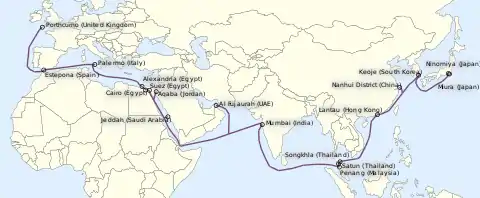 Fibre-optic Link Around the Globe (FLAG) is a 28,000-kilometre-long (17,398 mi; 15,119 nmi) fibre optic mostly-submarine communications cable that connects the United Kingdom, Japan, India, and many places in between. The cable is operated by Global Cloud Xchange, a subsidiary of RCOM.[1] The system runs from the eastern coast of North America to Japan.[2] Its Europe–Asia segment was the fourth longest cable in the world in 2008.[3]
