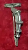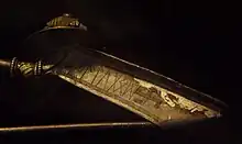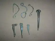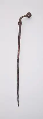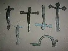 The classic fibula of the late-Roman era, and in fact the best known of all fibula types, is the crossbow type.[4][5] The crossbow fibula consists of a highly arched semi-circular bow, usually of squarish cross-section, and a long flat foot. The fibula has a wide transverse bar (or arms) at the head containing the pin-hinge. Crossbow fibulae usually have three round or onion-shaped knobs: one at the head and one at each end of the transverse bar.
