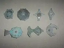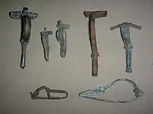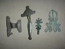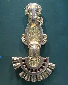 There are numerous types of post-Roman fibulae. The so-called Gothic group of bow fibulae have a round or triangular flat head plate, often with 3, 5 or 7 knobs, a small arched bow and a long flat diamond shaped foot. They were widely used by the Germanic Visigoths, Ostrogoths, and Gepids, and the non-Germanic Slavs and Avars, and are found over a wide part of southern and western Europe in the 5th and 6th centuries AD. Some historians have debated whether some of these Gothic fibulae could also be attributed to the Vandals.[6] There are also a wide variety of Anglo-Saxon fibulae from the 5th to 7th century such as the equal-arm type and the small-long type. Most Viking fibulae are variations on the ring or annular design (see below).