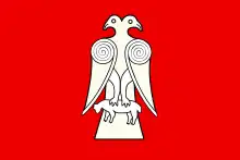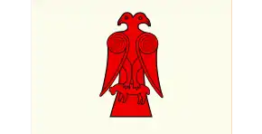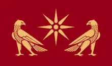 Today's tricolor flag bears little resemblance to the earliest Armenian 'flags'. In ancient times, armies went into battle behind carvings mounted on poles. The carvings might represent a dragon, an eagle, a lion or "some mysterious object of the gods".[1] With the advent of Christianity, the Armenian empire adopted many different flags representing various dynasties. The Artaxiad dynasty's flag, for instance, consisted of a red cloth displaying two eagles gazing at each other, separated by an eight-pointed star which might represent a flower or some mysterious object.[4]
