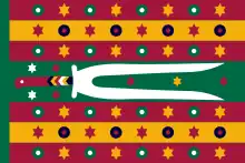 Believed to have been introduced by Hussein II, although some sources, such as Abdel-Wahab, claim that it was in use three centuries earlier,[3] the flag was rectangular in shape and divided into nine stripes, the middle one green and double the size of all other bands, while the others alternated between yellow and red.[2] Featured in the center of the green stripe was the Zulfiqar, the legendary Islamic sword of Ali, with the blade in white and the hilt multicolored. The red and yellow stripes each contained five equidistant symbols, whose order was alternated between each stripe. These symbols were divided into two categories: one red six-sided star voided with a disk of a different color in the center—either a red star and green disk or a white star and blue disk—, and a large disk voided in its lower right by a small disk of different color, with the combination being either a small red disk within a larger blue disk or a small yellow disk within a larger green disk.[2] The first yellow stripe contains three red stars and two blue disks. The second stripe, red in color, contains three green disksand two white stars. The third stripe (second yellow one) is identical to the first, with the exception that the star in its center is white, while the fourth stripe (second white one) is identical to the second stripe.[2]