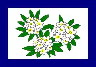 By 1907, the West Virginia Legislature found the 1905 state flag design to be completely unfeasible due to the lettering on one side reading toward the staff, and the differing colors on each respective side showing through the opposite side of the flag's white field of cloth.[5][8][12] The state legislature found that this destroyed "the distinctive features of the banner and leaving the state without a prescribed official flag".[12] The West Virginia Legislature sought to remedy the state flag's design flaws in 1907 so that the state could be properly represented at the Jamestown Exposition in Norfolk.[5][12] On February 25, 1907, during the administration of Governor William M. O. Dawson, the West Virginia Legislature passed Joint Resolution 2, which amended the flag by removing the seal and motto from the reverse side and changing the color of the bordering fringe from carmine red to old gold.[12] Instead of the seal and motto, the reverse of the flag was changed to consist of "a spring or sprig of the rhododendron maximum".[12] According to the 1907 joint resolution:[12]