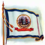 In January 1864, the West Virginia Legislature approved a flag for the Fourth Regiment West Virginia Volunteer Infantry to acknowledge the regiment's battles at Charleston, Vicksburg, Jackson, and Missionary Ridge, all four of which were listed on the flag.[8] This was the first among many battle flags to represent West Virginia after statehood which were utilized by soldiers of West Virginia regiments throughout the war.[5] State battle flags were presented to each of West Virginia's Union regiments during the course of the war.[5] These early state flags were squares of silk cloth measuring 6 feet (1.8 m), and were dark blue and trimmed with golden fringe.[5] The obverse side of these flags were painted with the state's newly minted seal within an oval, along with the name of the respective West Virginia regiment and the names and dates of the battles in which they had participated.[5] On the reverse side, the United States national emblem was painted and consisted of a bald eagle with its wings outstretched, clutching a bundle of 13 arrows in its right talon and an olive branch in its left, and a tricolor shield placed across its breast.[5] In its beak, the eagle clutched a scroll with the national Latin motto E pluribus unum (English: "Out of Many, One").[5] Following the conclusion of the American Civil War, the state of West Virginia had no official flag, and the matter was not taken up until the early 20th century.[5]