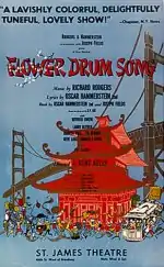 Flower Drum Song was the eighth musical by the team of Rodgers and Hammerstein. It is based on the 1957 novel, The Flower Drum Song, by Chinese-American author C. Y. Lee. It premiered on Broadway in 1958 and was then performed in the West End and on tour. It was adapted for a 1961 musical film.