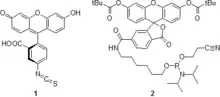 In oligonucleotide synthesis, several phosphoramidite reagents containing protected fluorescein, e.g. 6-FAM phosphoramidite 2,[20] are used for the preparation of fluorescein-labeled oligonucleotides.