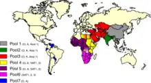 South Korea was hit by the rarer type A FMD in January, and then the type O infection in April.[64] The most serious case of foot-and-mouth outbreak in South Korea's history started in November 2010 in pig farms in Andong city of Gyeongsangbuk-do, and has since spread in the country rapidly.[65][66] More than 100 cases of the disease have been confirmed in the country so far,[65] and in January 2011, South Korean officials started a mass cull of approximately 12%, or around three million in total, of the entire domestic pig population, and 107,000 of three million cattle of the country to halt the outbreak.[65] According to the report based on complete 1D gene sequences, Korean serotype A virus was linked with those from Laos. Korean serotype O viruses were divided into three clades and were closely related to isolates from Japan, Thailand, the UK, France, Ireland, South Africa, and Singapore, as well as Laos.[67]