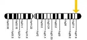 Fragile X syndrome is a genetic disorder which occurs as a result of a mutation of the Fragile X Messenger Ribonucleoprotein 1 (FMR1) gene on the X chromosome, most commonly an increase in the number of CGG trinucleotide repeats in the 5' untranslated region of FMR1.[14][34] Mutation at that site is found in 1 out of about every 2000 males and 1 out of about every 259 females. Incidence of the disorder itself is about 1 in every 3600 males and 1 in 4000–6000 females.[43] Although this accounts for over 98% of cases, FXS can also occur as a result of point mutations affecting FMR1.[14][34]