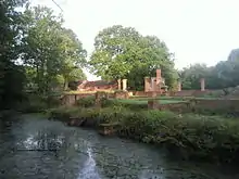 In his will, dated 12 December 1589, Walsingham complained of "the greatness of my debts and the mean state [I] shall leave my wife and heirs in",[138] but the true state of his finances is unclear.[139] He received grants of land from the Queen, grants for the export of cloth and leases of customs in the northern and western ports. His primary residences, apart from the court, were in Seething Lane by the Tower of London (now the site of a Victorian office building called Walsingham House), at Barn Elms in Surrey and at Odiham in Hampshire. Nothing remains of any of his houses.[35] He spent much of his own money on espionage in the service of the Queen and the Protestant cause.[140] In 1586, he funded a lectureship in theology at Oxford University for the Puritan John Rainolds.[141] He had underwritten the debts of his son-in-law, Sir Philip Sidney,[142] had pursued the Sidney estate for recompense unsuccessfully and had carried out major land transactions in his later years. After his death, his friends reflected that poor bookkeeping had left him further in the Crown's debt than was fair. In 1611, the Crown's debts to him were calculated at over £48,000, but his debts to the Crown were calculated at over £43,000 and a judge, Sir Julius Caesar, ordered both sets of debts cancelled quid pro quo.[139] Walsingham's surviving daughter Frances received a £300 annuity,[138] and married the Earl of Essex. Ursula, Lady Walsingham, continued to live at Barn Elms with a staff of servants until her death in 1602.[143]
