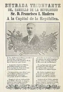 A member of one of Mexico's wealthiest families, Madero studied business at the École des Hautes Études Commerciales de Paris. An advocate for social justice and democracy, his 1908 book The Presidential Succession in 1910 called Mexican voters to prevent the reelection of Porfirio Díaz, whose regime had become increasingly authoritarian. Bankrolling the opposition Anti-Reelectionist Party, Madero's candidacy garnered widespread support in the country.[9] He challenged Díaz in the 1910 election, which resulted in his arrest. After Díaz declared himself winner for an eighth term in a rigged election,[10] Madero escaped from jail, fled to the United States, and called for the overthrow of his regime in the Plan of San Luis Potosí, sparking the Mexican Revolution.