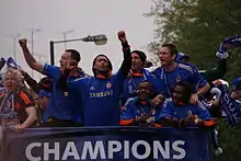 In April 2005, Lampard scored both goals against Bolton Wanderers in a 2–0 win which was the Premier League title-winning match for Chelsea, which also won the first major trophy of his career as Chelsea bagged their first top-flight title in 50 years, by a 12-point margin. He was named as Barclays Player of the Season for 2004–05.[48] Though Chelsea were eliminated in the Champions League semi-finals by league rivals Liverpool, they took home the Football League Cup, in which Lampard scored twice in six matches, which included the opening goal against Manchester United in the League Cup semi-final, which Chelsea won 2–1. He landed his first personal award by being named the 2005 Footballer of the Year.[49]