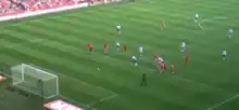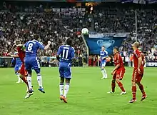 In August 2004, he scored the winning goal against Southampton in the Premier League,[44] and continued scoring important goals as he scored both in a 2–0 win against Tottenham.[45] In March 2005 he scored a long-range goal from 30 yards against Crystal Palace in the Premier League which Chelsea won 4–1. Lampard continued his season strongly, and his brilliant performances for Chelsea in the Premier League and Champions League further increased his reputation as one of the best midfielders in the world. In the 2004–05 Champions League, he scored one of the goals in Chelsea's famous 4–2 win over Barcelona, helping Chelsea to progress to the quarter-finals.[46] In the quarter-finals, he scored three goals in two legs against Bayern Munich as Chelsea won 6–5 on aggregate. His second goal in the first leg was a spectacular one; he controlled Claude Makélélé's cross with his chest then turned and swivelled and sent the ball inside the far post with a left-foot half volley.[47]