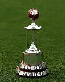 The Frank Worrell Trophy is awarded to the winner of the West Indies–Australia Test match series in cricket.[5] The trophy is named after Frank Worrell who was the first black captain of the West Indies. It was first awarded at the end of the 1960–61 series in Australia, the first Test of which ended in a tie.[6] The Australian Cricket Board of Control and Don Bradman commissioned former Test cricketer and professional jeweller Ernie McCormick to create a perpetual trophy following the tie.[7][8] The trophy's design incorporated a ball used in the tied Test.[8][9]