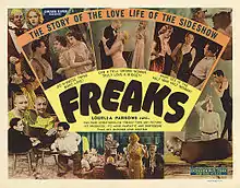 Though it received critical backlash and was a box-office failure upon initial release, Freaks was subject to public and critical reappraisal in the 1960s, as a long forgotten Hollywood classic, particularly in Europe, and was screened at the 1962 Venice Film Festival. In retrospect, numerous film critics have suggested that the film presents a starkly sympathetic portrait of its sideshow characters rather than an exploitative one, with Andrew Sarris declaring Freaks one of the "most compassionate" films ever made.[9] Nonetheless, critics have continued to take note of the film's horror elements; in 2009, Joe Morgenstern proclaimed that Freaks contains some of the most terrifying scenes in film history. Film scholars have interpreted the film as a metaphor for class conflict, reflecting the Great Depression, and it has been studied for its portrayal of people with disabilities, with theorists arguing that it presents an anti-eugenics message. The film has been highly influential, has become a cult classic, and, in 1994, was selected for preservation by the United States National Film Registry, which seeks to preserve films that are "culturally, historically, or aesthetically significant".[10][11]