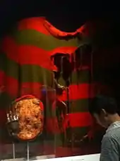 Freddy's glove appeared in the 1987 horror-comedy Evil Dead II above the door on the inside of a toolshed. This was Sam Raimi's response to Wes Craven showing footage of The Evil Dead in A Nightmare on Elm Street, which was a response to Raimi putting a poster of Craven's 1977 film The Hills Have Eyes in The Evil Dead. This, in turn, was a response to a ripped-up Jaws poster in The Hills Have Eyes.[27] The glove also appears in the 1998 horror-comedy Bride of Chucky in an evidence locker room that also contains the remains of the film's villain Chucky, the chainsaw of Leatherface from The Texas Chainsaw Massacre, and the masks of Michael Myers from Halloween and Jason Voorhees from Friday the 13th.