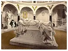 From April 1888, Frederick became so weak he was unable to walk, and was largely confined to his bed; his continual coughing brought up large quantities of pus. In early June, the cancer spread to and perforated his esophagus, preventing him from eating.[90] He suffered from bouts of vomiting and ran high fevers, but remained alert enough to write a last diary entry on 11 June: "What's happening to me? I must get well again; I have so much to do!"[90] Frederick III died in Potsdam at 11:30 a.m. on 15 June 1888, and was succeeded by his 29-year-old son Wilhelm II.[90] Frederick III is buried in a mausoleum attached to the Friedenskirche in Potsdam.[91] After his death, William Ewart Gladstone described him as the "Barbarossa of German liberalism".[92] Empress Victoria went on to continue spreading Frederick's thoughts and ideals throughout Germany, but no longer had power within the government.[93] His premature demise is considered a potential turning point in German history.[94]