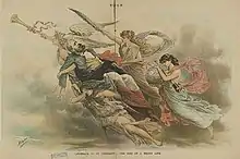 Because William was a dogmatic soldier and unlikely to change his ideas at the age of sixty-four,[31] he regularly clashed with the Diet over policies. In September 1862, one such disagreement almost led to Frederick being crowned and replacing his father as king; William threatened to abdicate when the Diet refused to fund his plans for the army's reorganization. Frederick was appalled by this action, and said that an abdication would "constitute a threat to the dynasty, country and Crown".[32] William reconsidered, and instead on the advice of Minister of War Albrecht von Roon appointed Otto von Bismarck, who had offered to push through the military reform even against the majority of the Diet, as Minister-President. The appointment of Bismarck, an authoritarian who would often ignore or overrule the Diet, set Frederick on a collision course with his father and led to his exclusion from affairs of state for the rest of William's reign. Frederick insisted on bloodless "moral conquests", unifying Germany by liberal and peaceful means, but it was Bismarck's policy of blood and iron that prevailed.[17] His protests against William's rule peaked at Danzig on 4 June 1863, where at an official reception in the city he loudly denounced Bismarck's restrictions on freedom of the press.[33][34][35] He thereby made Bismarck his enemy and his father extremely angry.[14] Consequently, Frederick was excluded from positions of political power throughout his father's reign. Retaining his military portfolio, he continued to represent Germany and its Emperor at ceremonies, weddings, and celebrations such as Queen Victoria's Golden Jubilee in 1887.[36] Frederick would spend a large portion of time in Britain, where Queen Victoria frequently allowed him to represent her at ceremonies and social functions.[37]