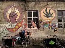 In 2002, the government began aiming to make the cannabis trade less visible. In response, the cannabis sellers covered their stands in military camouflage nets as a humorous reply.[50] The open cannabis trade returned to Pusher Street after police raids in 2004, but the stalls were again torn down by Christiania's residents after the 2016 shooting.[45] As of June 2023, there were numerous cannabis sellers on Pusher Street openly selling their wares from makeshift stalls with spray painted signs advertising the strain of cannabis for sale. One dealer said the police raid the street daily, but an early warning system of lookouts allows the dealers to close up shop before the police arrive. In August 2023, residents blocked the entrances to Pusher Street with concrete barriers and bars.[47]