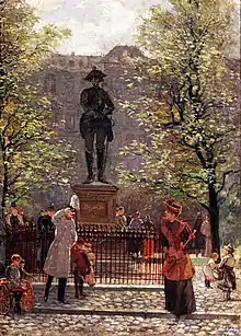 In 1851, Frederick William IV, Frederick's great-great nephew, included Seydlitz's name on the Equestrian statue of Frederick the Great in Berlin, honoring those who had helped to build the Prussian state. Seydlitz holds a position of honor as one of the four full-sized mounted figures, sharing the first tier of the plinth with the King's brother, his cousin, and Hans Joachim von Zieten.[26] A bronze sculpture installed at Wilhelmplatz, in Berlin, was created by Anton Lulvès, a copper worker from Hamburg.[27] SMS Seydlitz, representing the first generation of battlecruisers, was ordered in 1910 and commissioned in May 1913, the fourth such vessel built for the Imperial German Navy's High Seas Fleet.[28] The heavy cruiser Seydlitz, of the Admiral Hipper class, was launched in 1939, but never completed.[29]