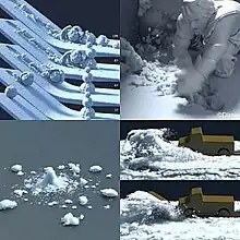 Another challenge that the studio had to face was to deliver shots of heavy and deep snow that both interacted believably with characters and had a realistic sticky quality.[91] According to principal software engineer Andrew Selle, "[Snow]'s not really a fluid. It's not really a solid. It breaks apart. It can be compressed into snowballs. All of these different effects are very difficult to capture simultaneously."[77] In order to achieve this, software engineers used advanced mathematics (the material point method) and physics, with assistance from mathematics researchers at the University of California, Los Angeles[92][93] to create a snow simulator software application called Matterhorn. The tool was capable of depicting realistic snow in a virtual environment and was used in at least 43 scenes in the film, including several key sequences.[52][91][92][94] Software engineer Alexey Stomakhin referred to snow as "an important character in the film",[92] therefore it attracted special attention from the filmmakers.[77] "When you stretch it, snow will break into chunks. Since snow doesn't have any connections, it doesn't have a mesh, it can break very easily. So that was an important property we took advantage of," explained Selle. "There you see [Kristoff] walking through and see his footprints breaking the snow into little pieces and chunk up and you see [Anna] being pulled out and the snow having packed together and broken into pieces. It's very organic how that happens. You don't see that they're pieces already – you see the snow as one thing and then breaking up."[91] The tool also proved to be particularly useful in scenes involving characters walking through deep snow, as it ensured that the snow reacted naturally to each step.[77]