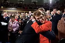 On January 22, 2012, Giffords announced in a video statement that she intended to resign her seat so that she could focus on her recovery.[91] She attended President Obama's 2012 State of the Union Address on January 24, and formally submitted her resignation on January 25. Appearing on the floor of the House, after the last bill she sponsored was brought to a vote and unanimously passed, Giffords was lauded by members of Congress and the majority and minority leaders who spoke in tribute to her strength and accomplishment in an unusual farewell ceremony. Her letter of resignation was read on her behalf by her close friend and fellow Democratic representative, Debbie Wasserman Schultz.[92][93]