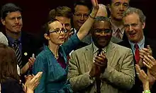 Giffords has made appearances at the three Democratic National Conventions held since she left congress. On September 6, 2012, Giffords led the Pledge of Allegiance at that evening's meeting of the 2012 Democratic National Convention.[97] At the 2016 Democratic National Convention, Giffords delivered a speech in support of presidential nominee Hillary Clinton.[98] For the 2020 Democratic National Convention, Giffords delivered a speech supporting presidential nominee Joe Biden and urging action on gun control.[99]