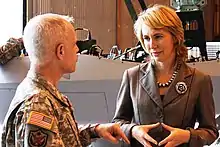 During the 2007 session of Congress, Giffords introduced a bill (H.R. 1441)[27] that forbids the sale of F-14 aircraft parts on the open market to prevent them from being acquired by Iran.[28] Giffords advocated for a national day of recognition for cowboys as one of her first actions.[29] She voted for the contentious May 2007 Iraq Emergency Supplemental Spending bill, saying, "I cannot, in good conscience, allow the military to run out of money while American servicemen and women are being attacked every day".[30] She has also been a Girl Scout supporter for many years. On April 21, 2007, Giffords hosted her third "Congress on Your Corner" in Tucson, Arizona, and kicked things off by speaking to the Girl Scouts of Southern Arizona, Sahuaro Council.